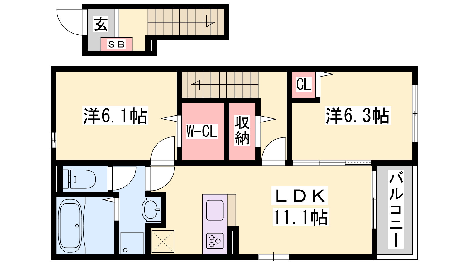 - LDK11.1帖、洋室6.3帖、洋室6.1帖