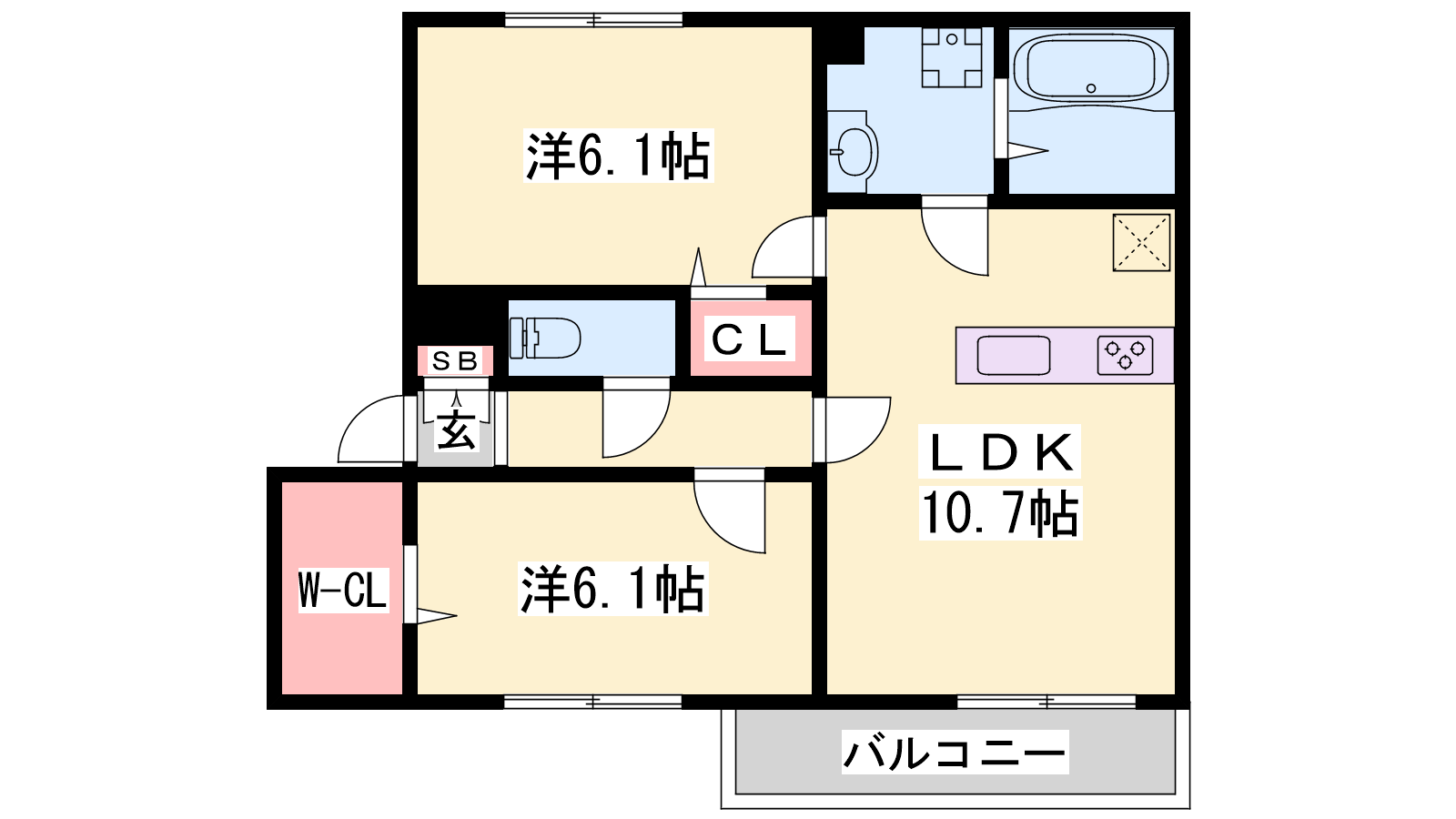 - LDK10.7帖、洋室6.1帖、洋室6.1帖