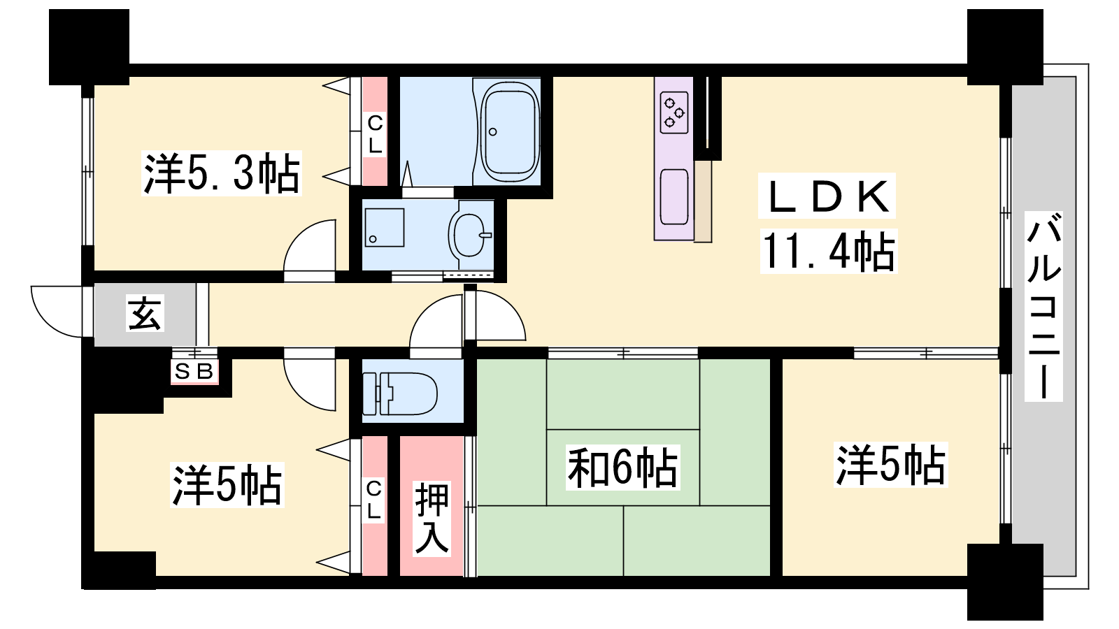 - LDK11.4帖、洋室5.3帖、洋室5帖、洋室5帖、和室6帖