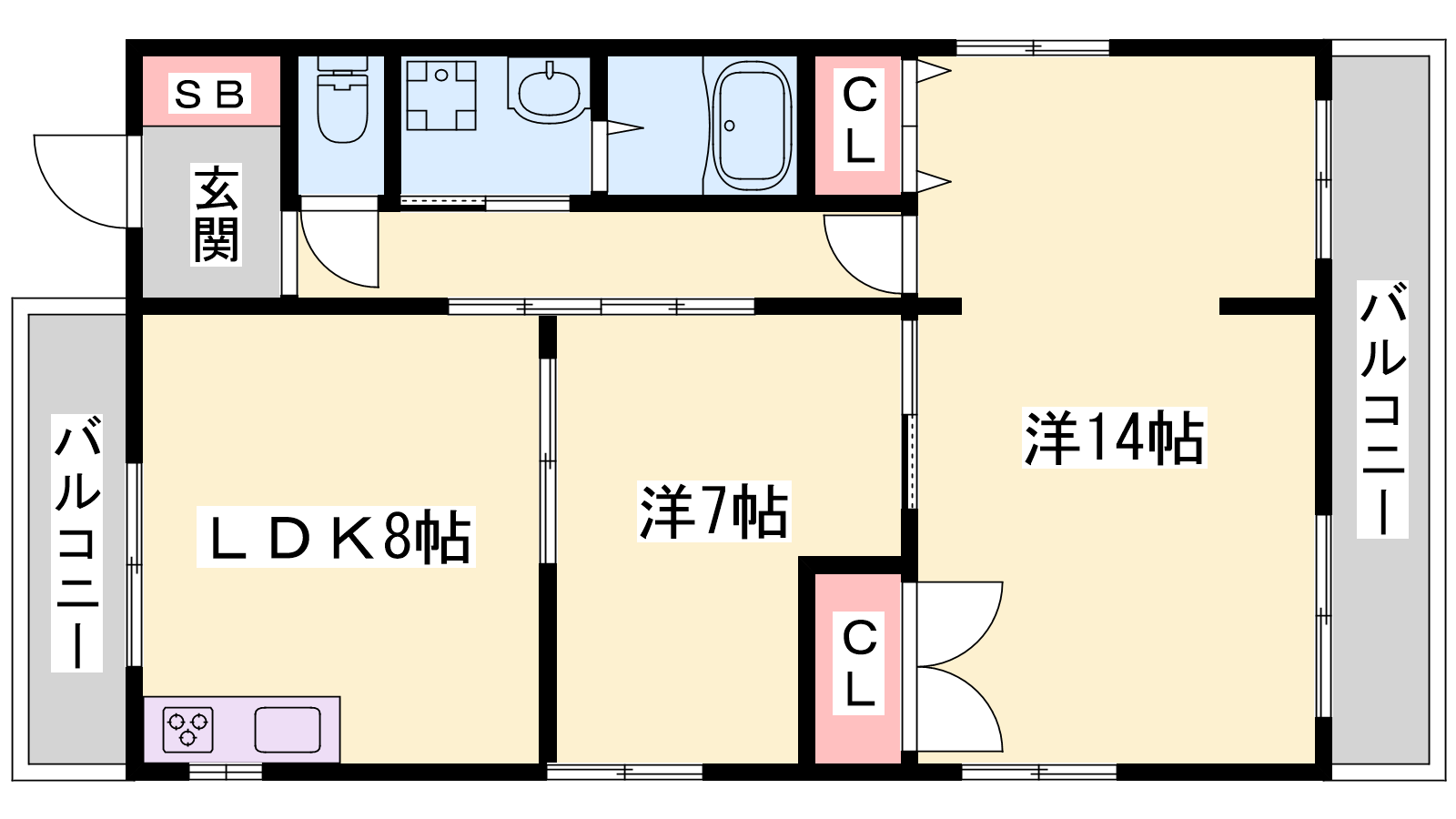 - DK8帖、洋室14帖、洋室7帖