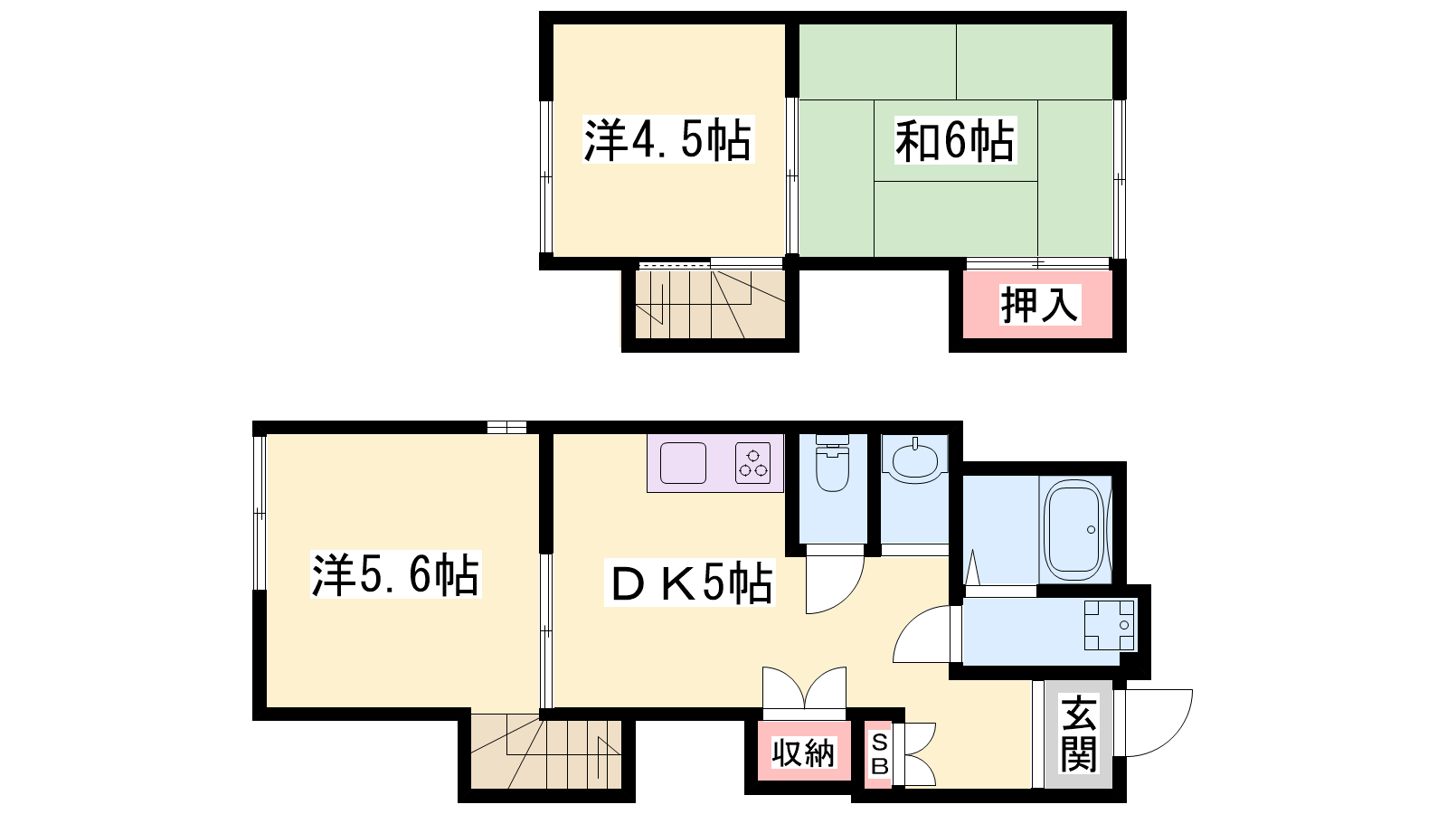 - DK5帖、洋室5.6帖、洋室4.5帖、和室6帖