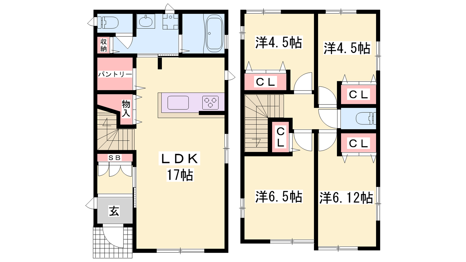 - LDK17帖、洋室6.5帖、洋室6.12帖、洋室4.5帖、洋室4.5帖