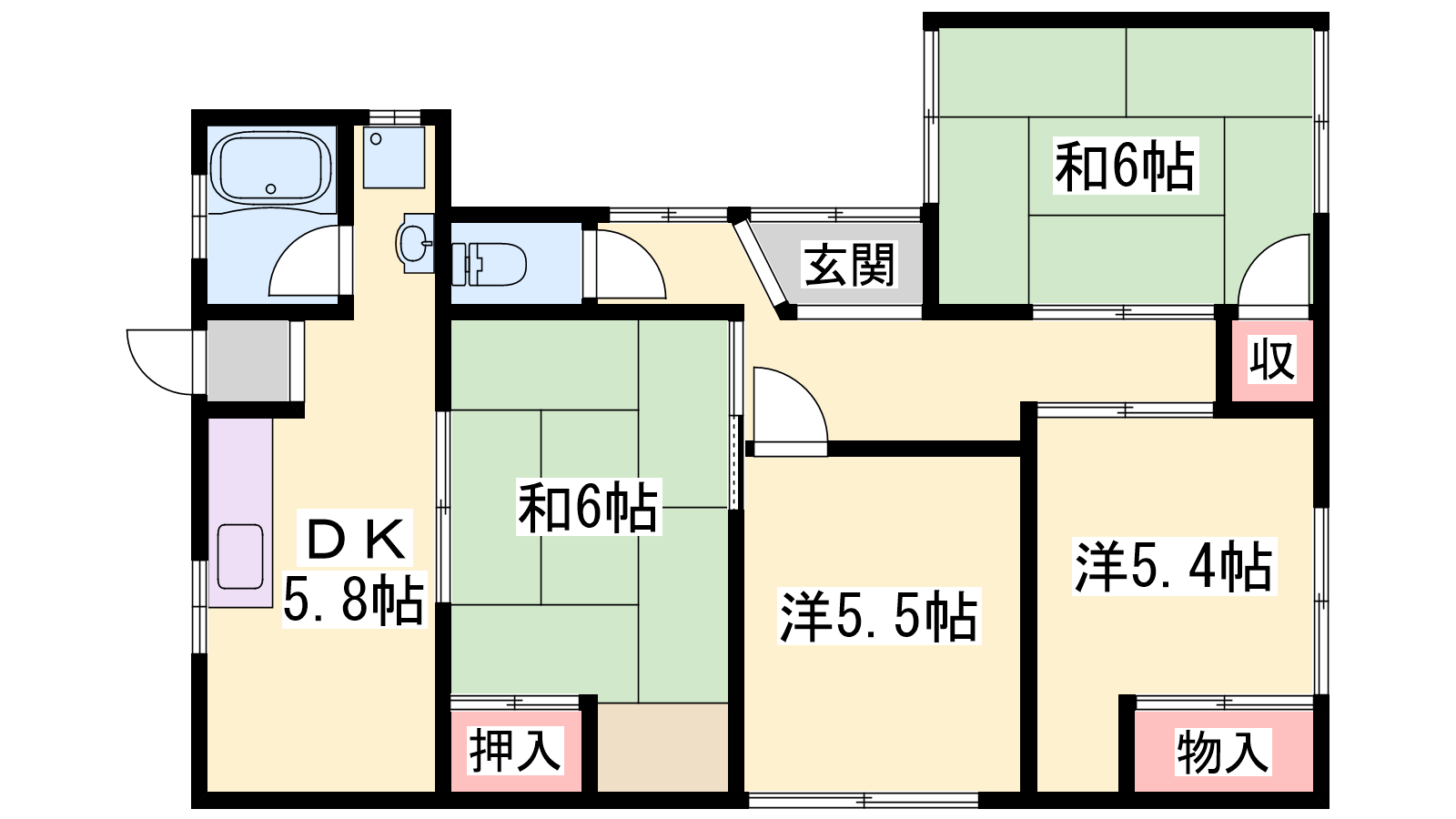 - DK5.8帖、洋室5.5帖、洋室5.4帖、和室6帖、和室6帖