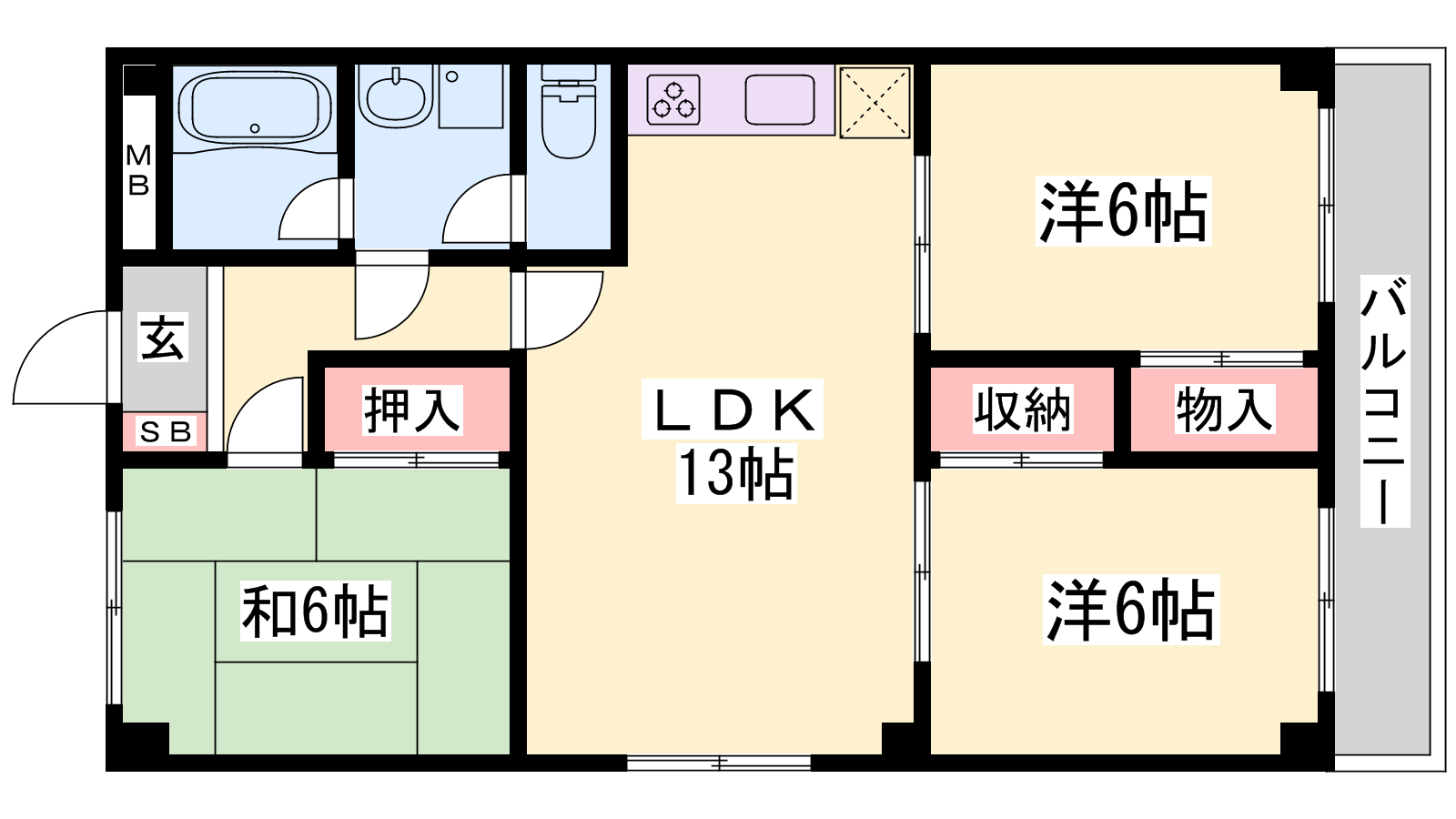 - LDK13.1帖、洋室5.9帖、洋室5.9帖、和室5.9帖