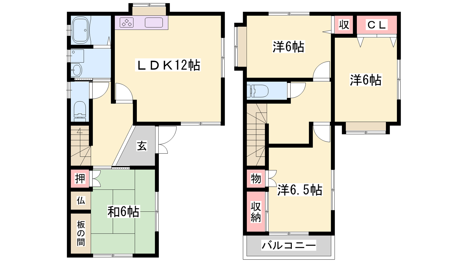 - LDK12帖、洋室6.5帖、洋室6帖、洋室6帖、和室6帖
