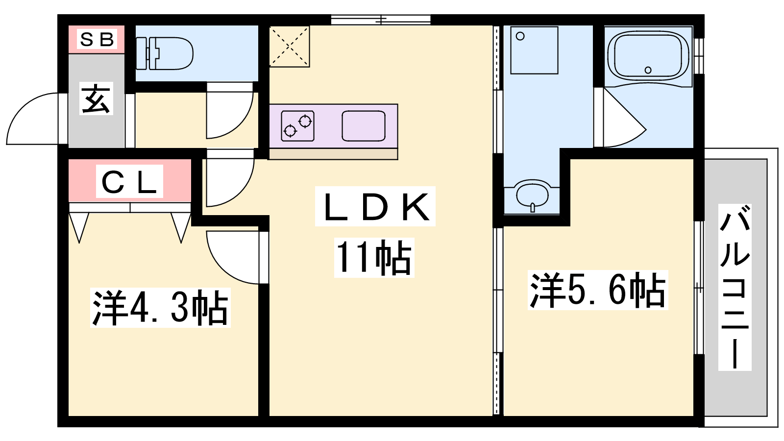 - LDK11帖、洋室5.6帖、洋室4.3帖