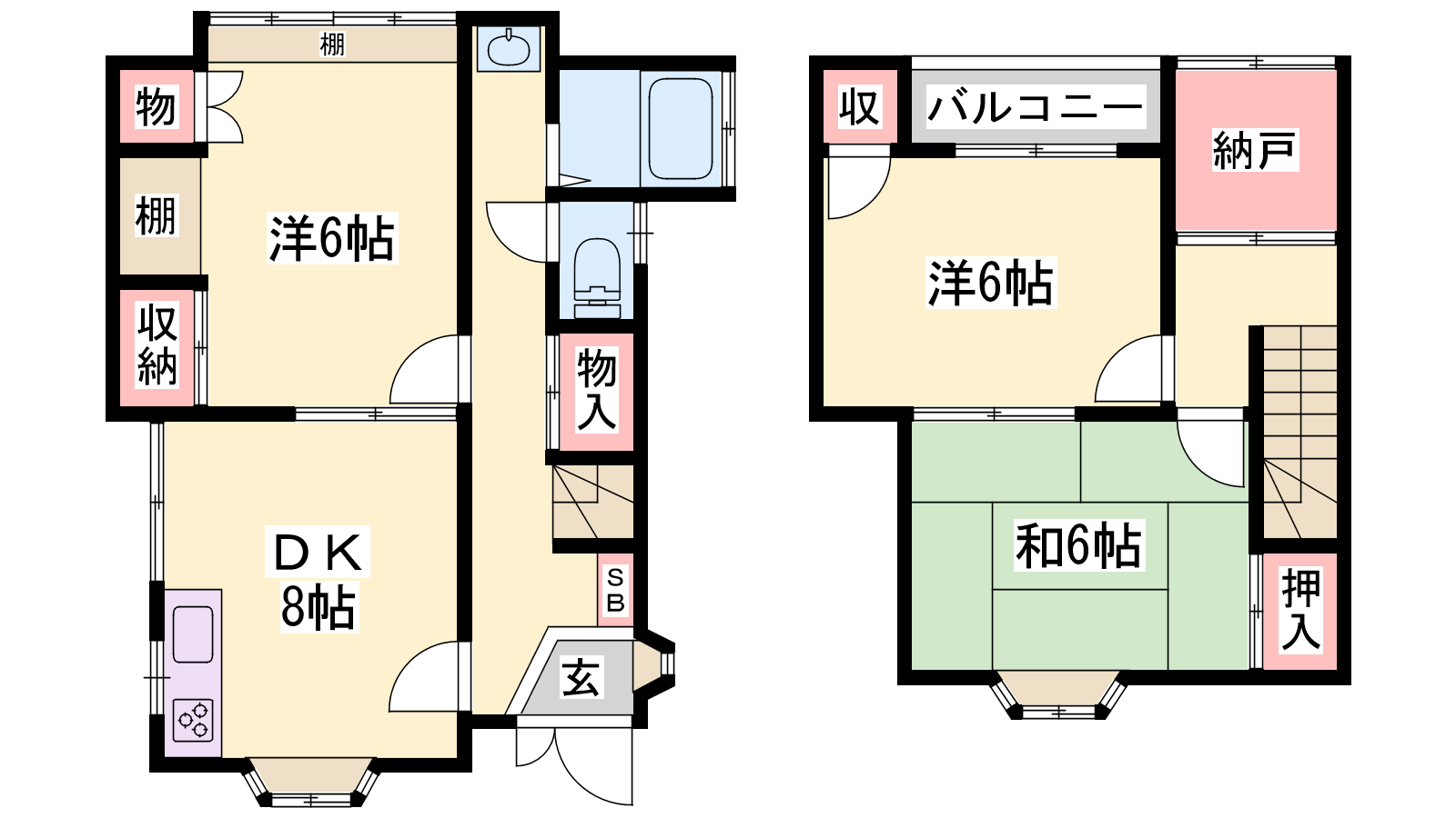- DK8帖、洋室6帖、洋室6帖、和室6帖