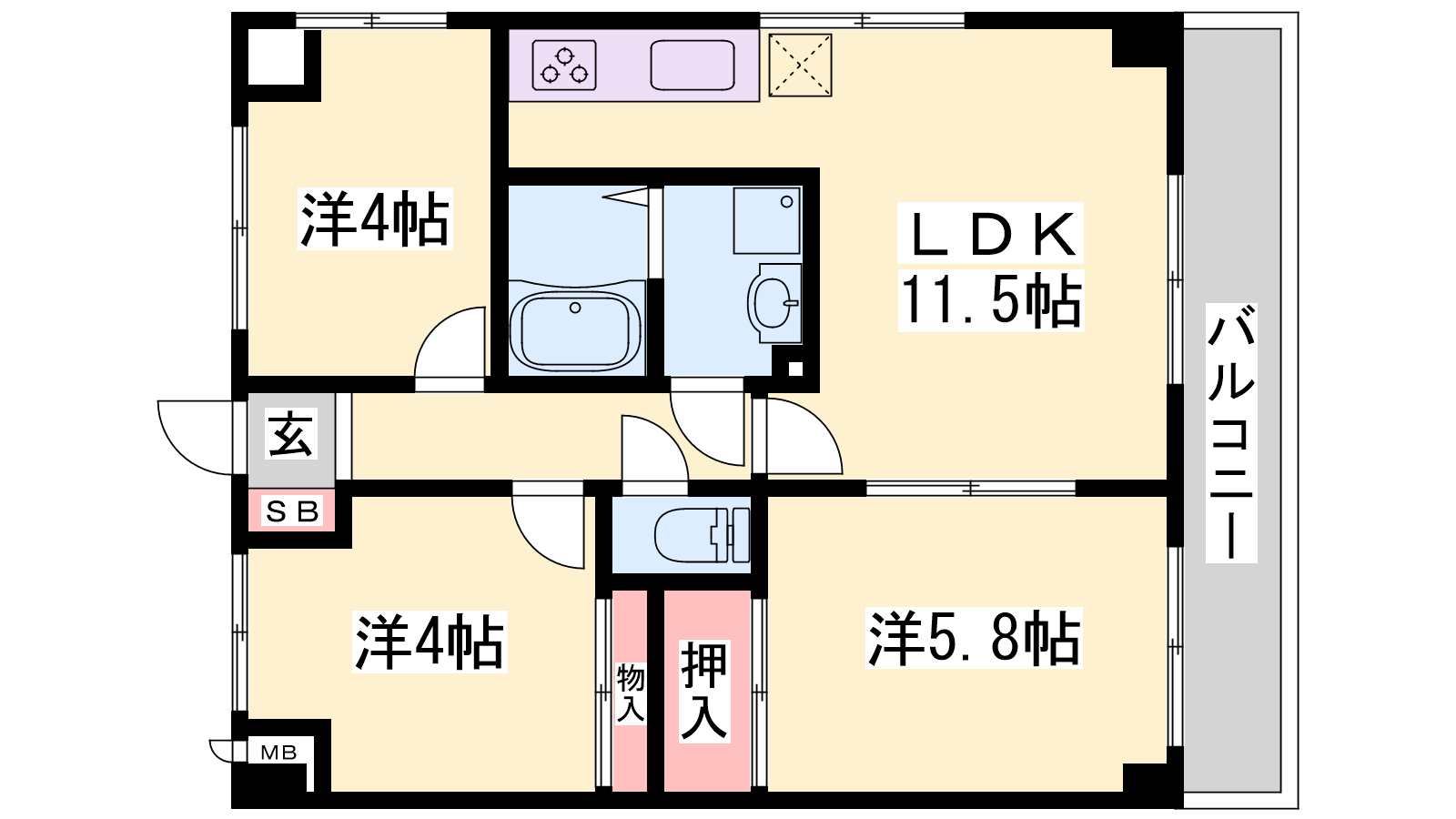 - LDK11.5帖、洋室5.8帖、洋室4帖、洋室4帖