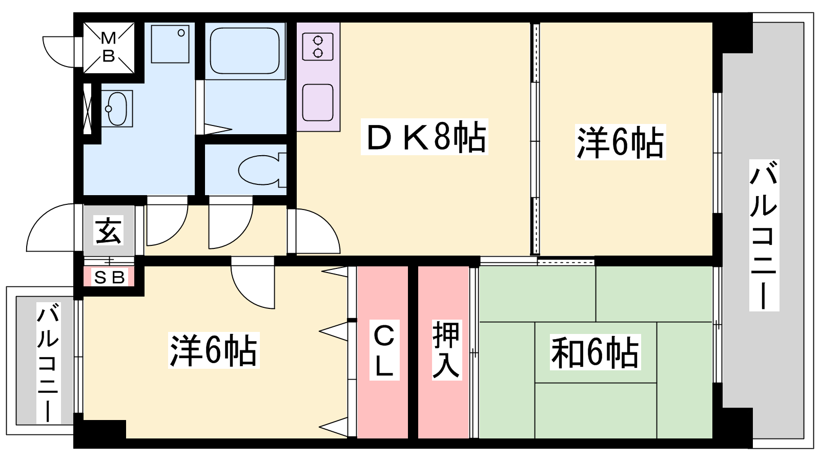 - DK8帖、洋室6帖、洋室6帖、和室6帖