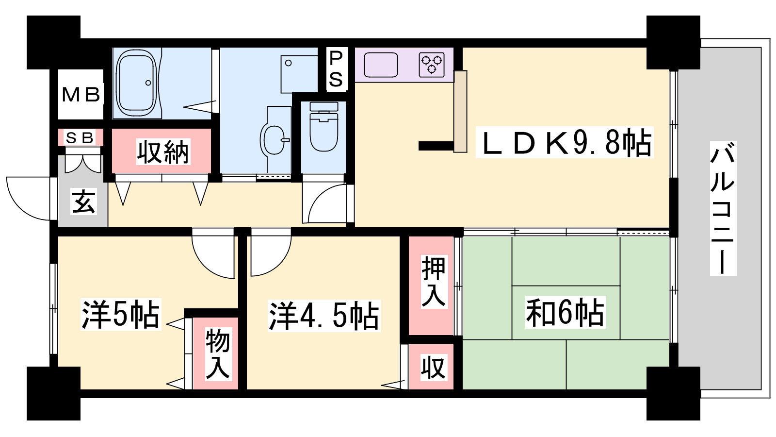 - LDK9.8帖、和室6帖、洋室5帖、洋室4.5帖