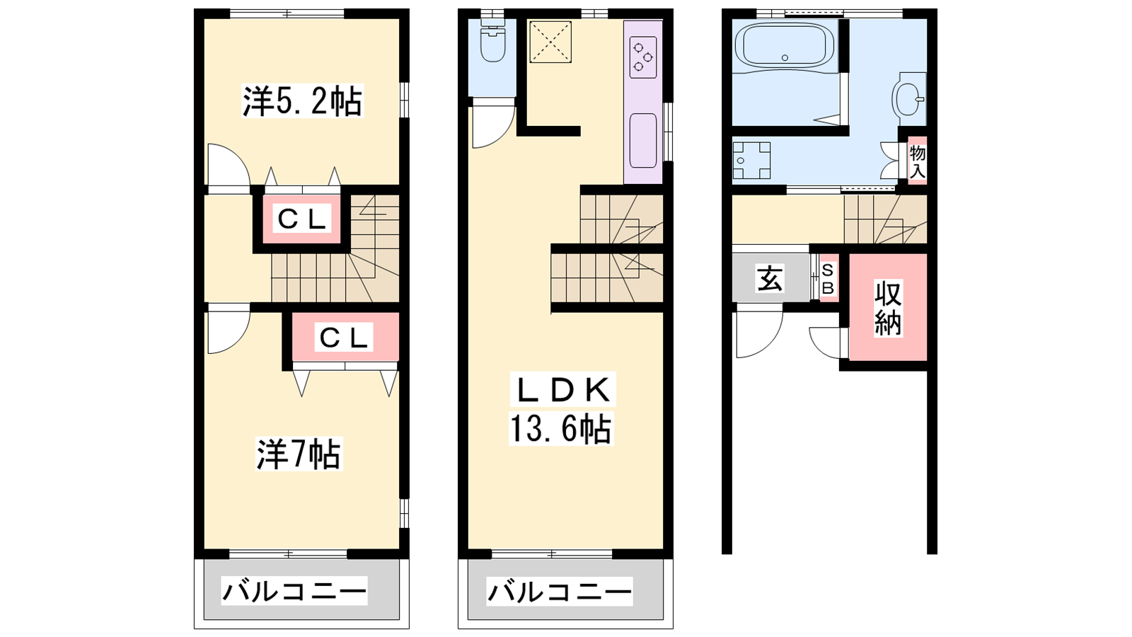 - LDK13.1帖、洋室6.2帖、洋室5.2帖