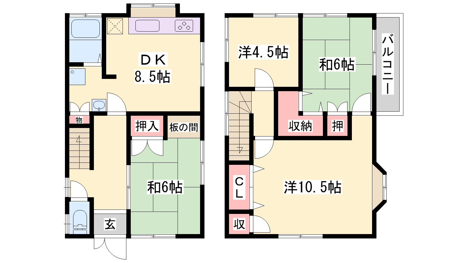- DK8帖、洋室10.5帖、洋室4.5帖、和室6帖、和室6帖