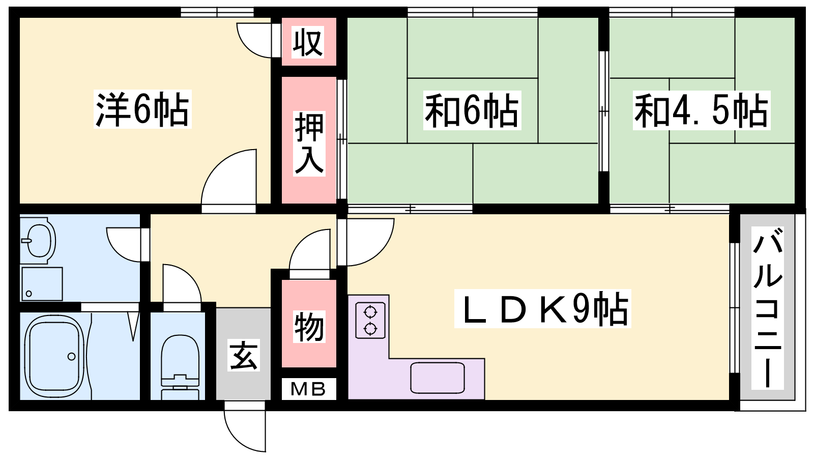 - LDK9帖、洋室6.8帖、洋室6帖、和室4.5帖