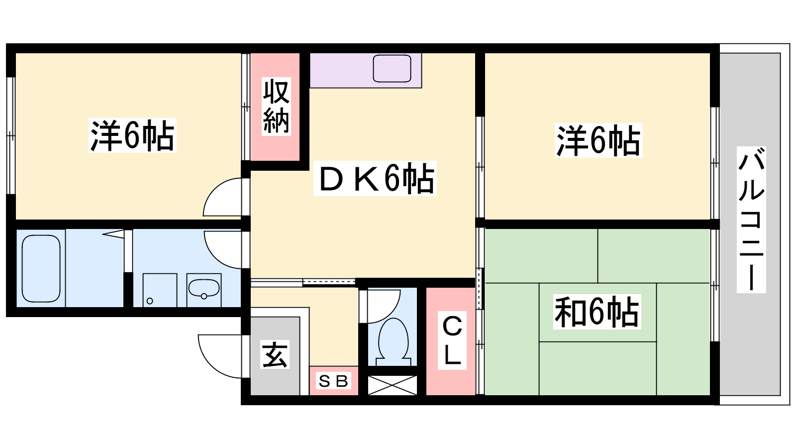 - LDK12帖、洋室6帖、洋室6帖