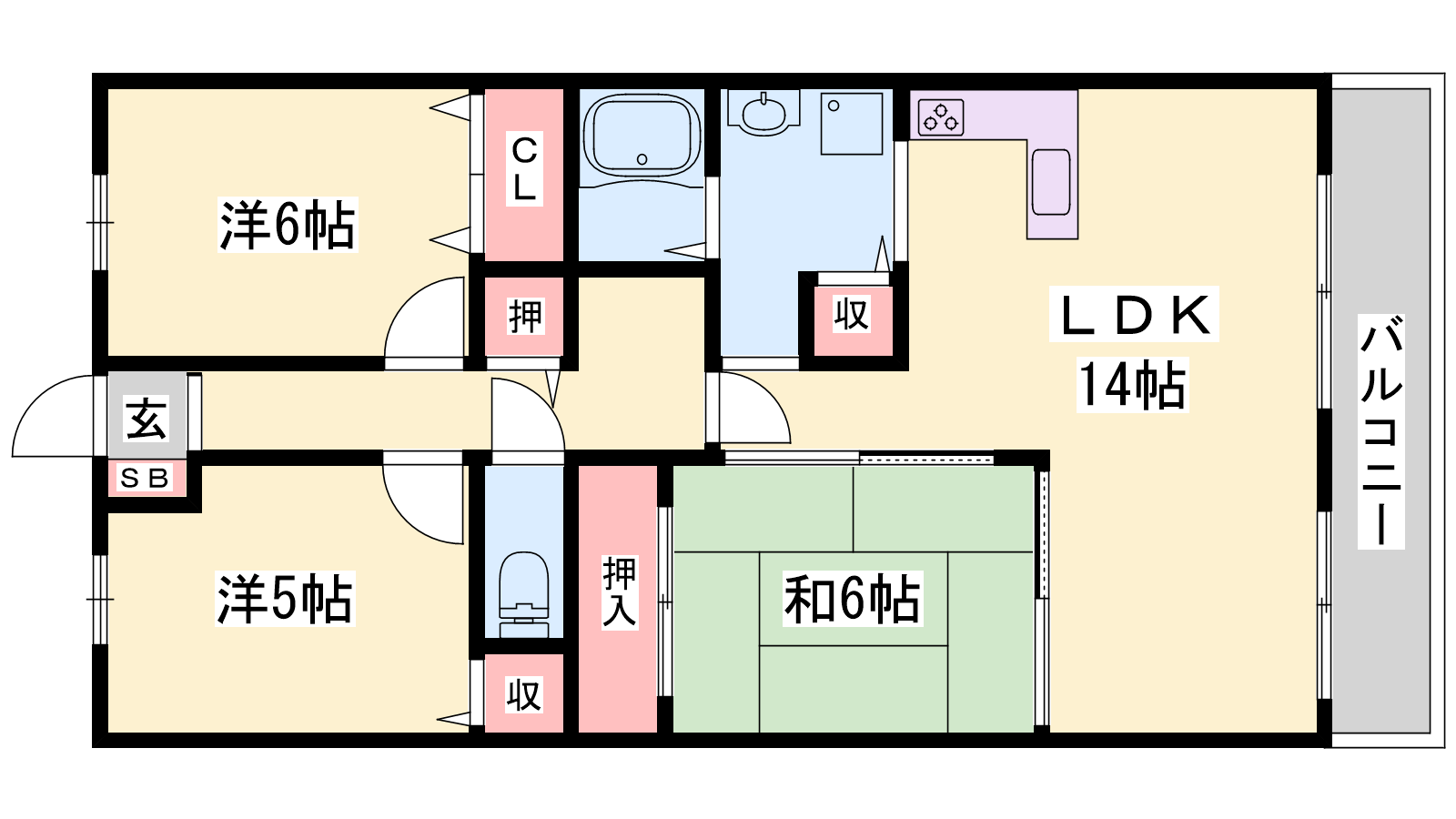 - LDK14帖、和室6帖、洋室6帖、洋室5帖
