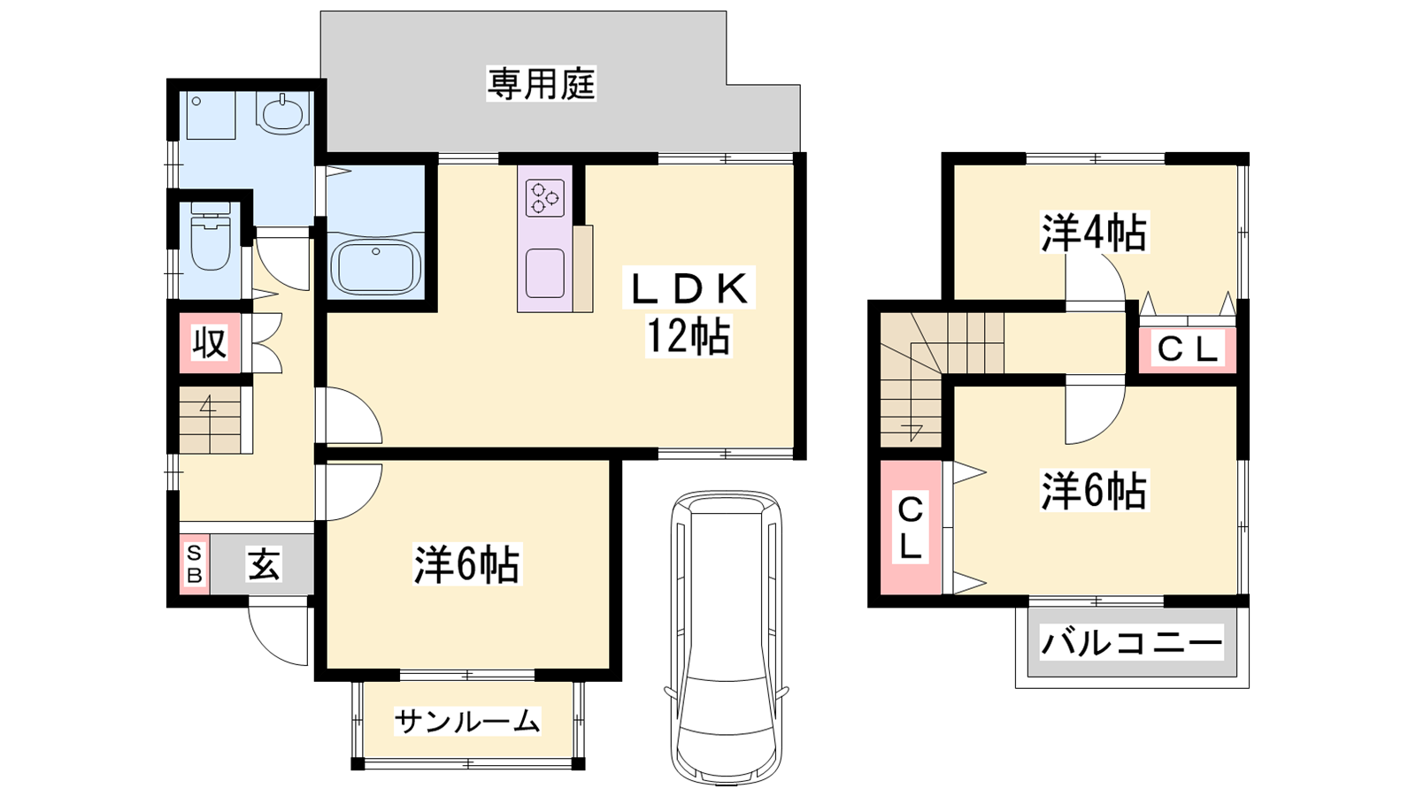 - LDK12帖、洋室6帖、洋室6帖、洋室4帖