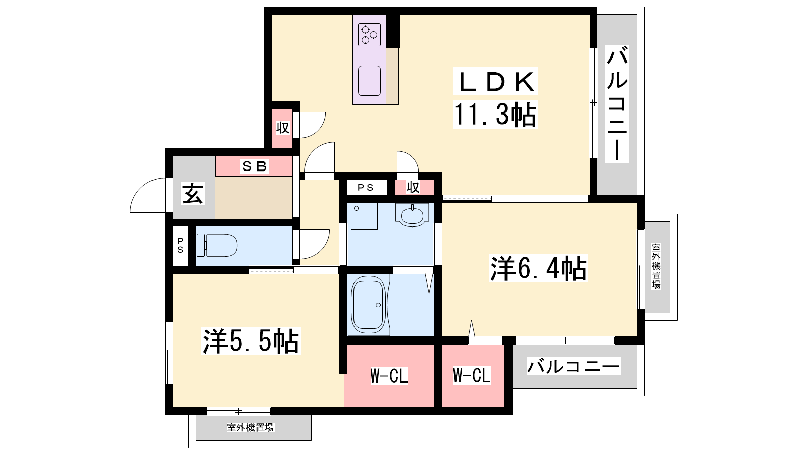 - LDK11.3帖、洋室6.4帖、洋室5.5帖