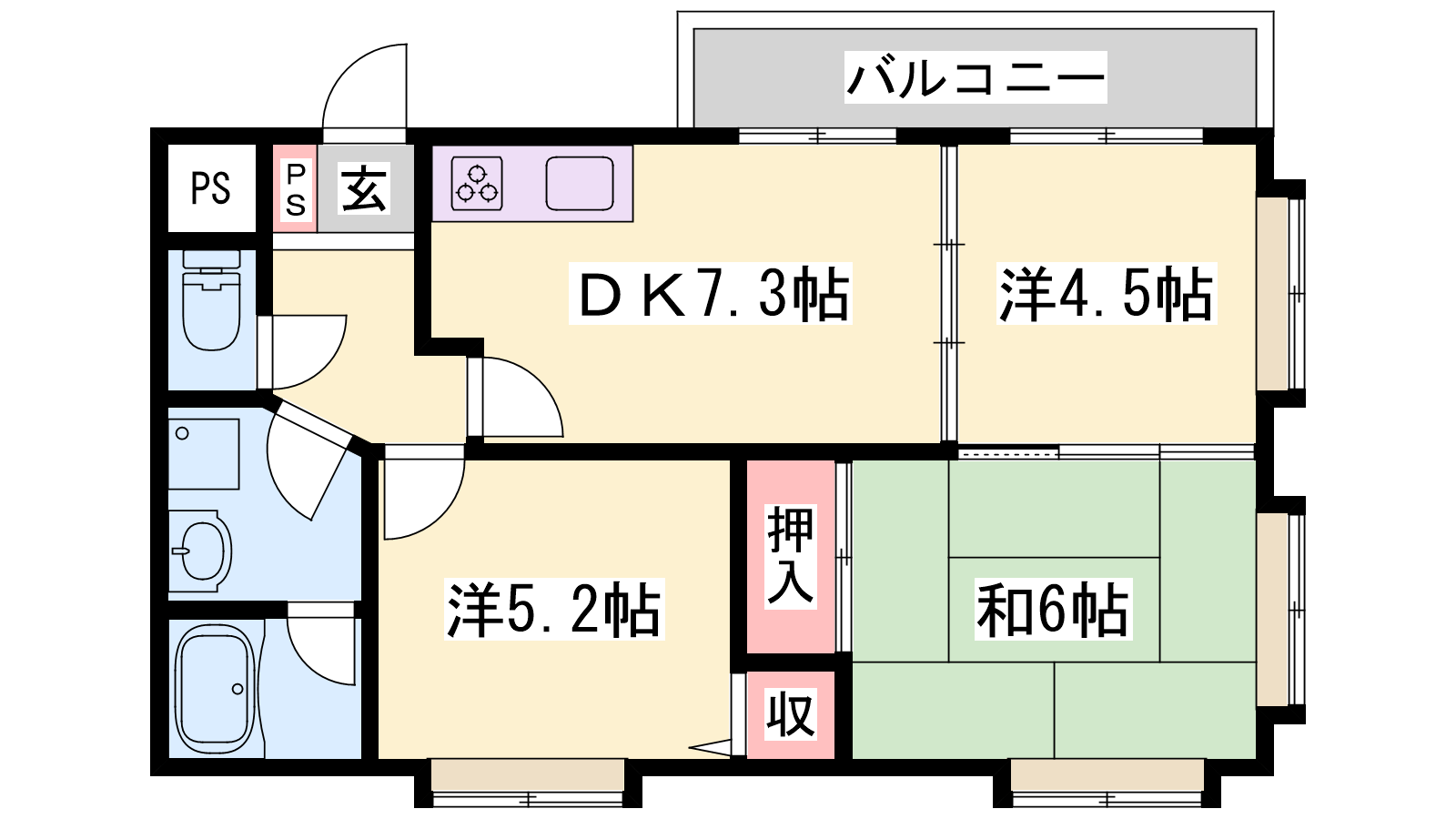 - DK7.3帖、和室6帖、洋室5.2帖、洋室4.5帖