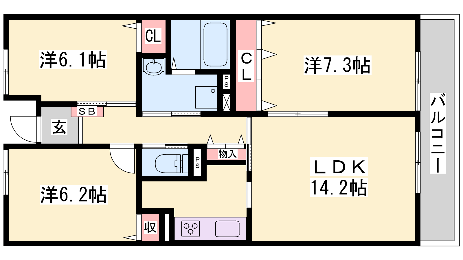 - LDK14.2帖、洋室7.3帖、洋室6.2帖、洋室6.1帖