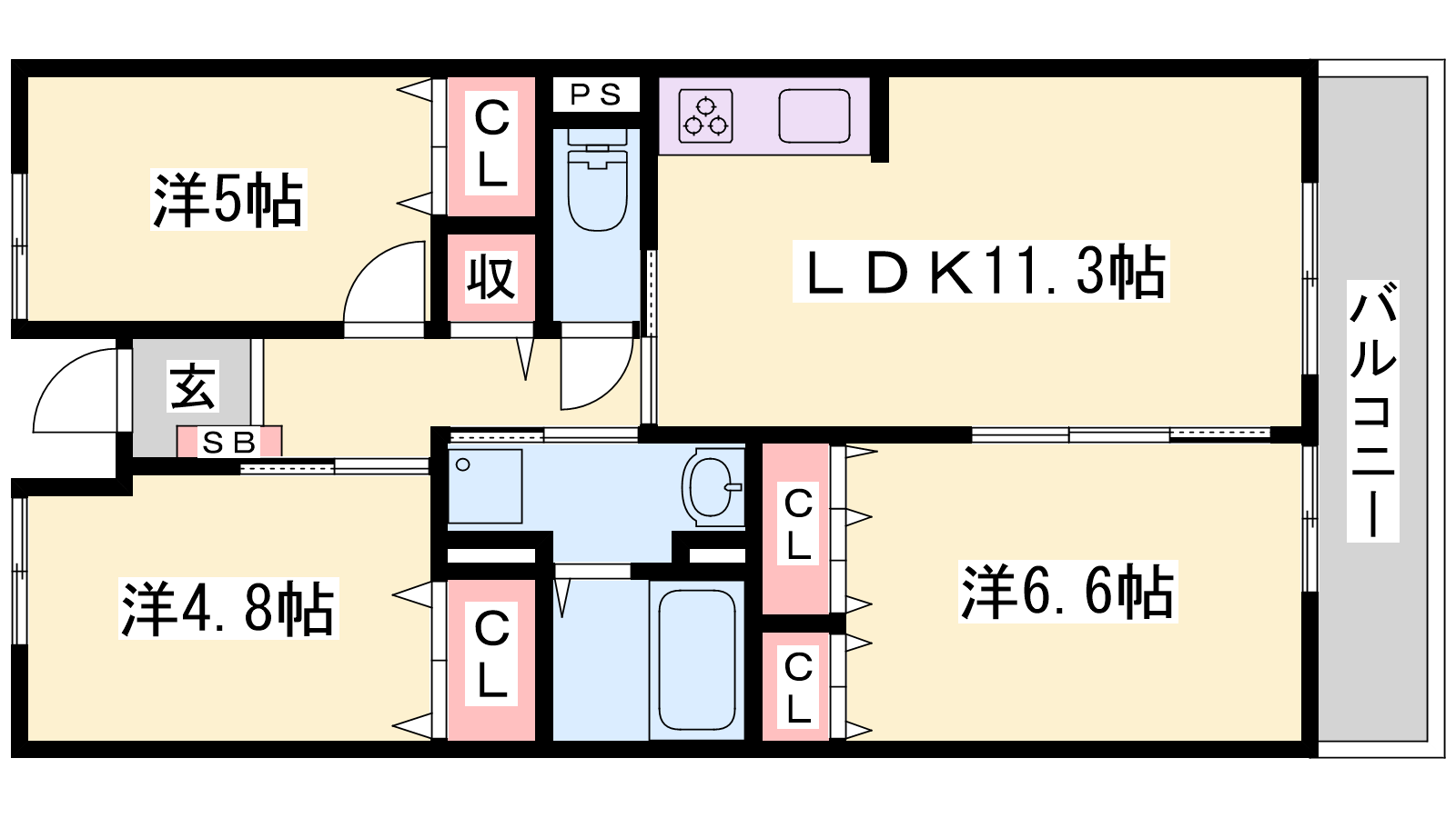 - LDK11.3帖、洋室6.6帖、洋室5帖、洋室4.8帖