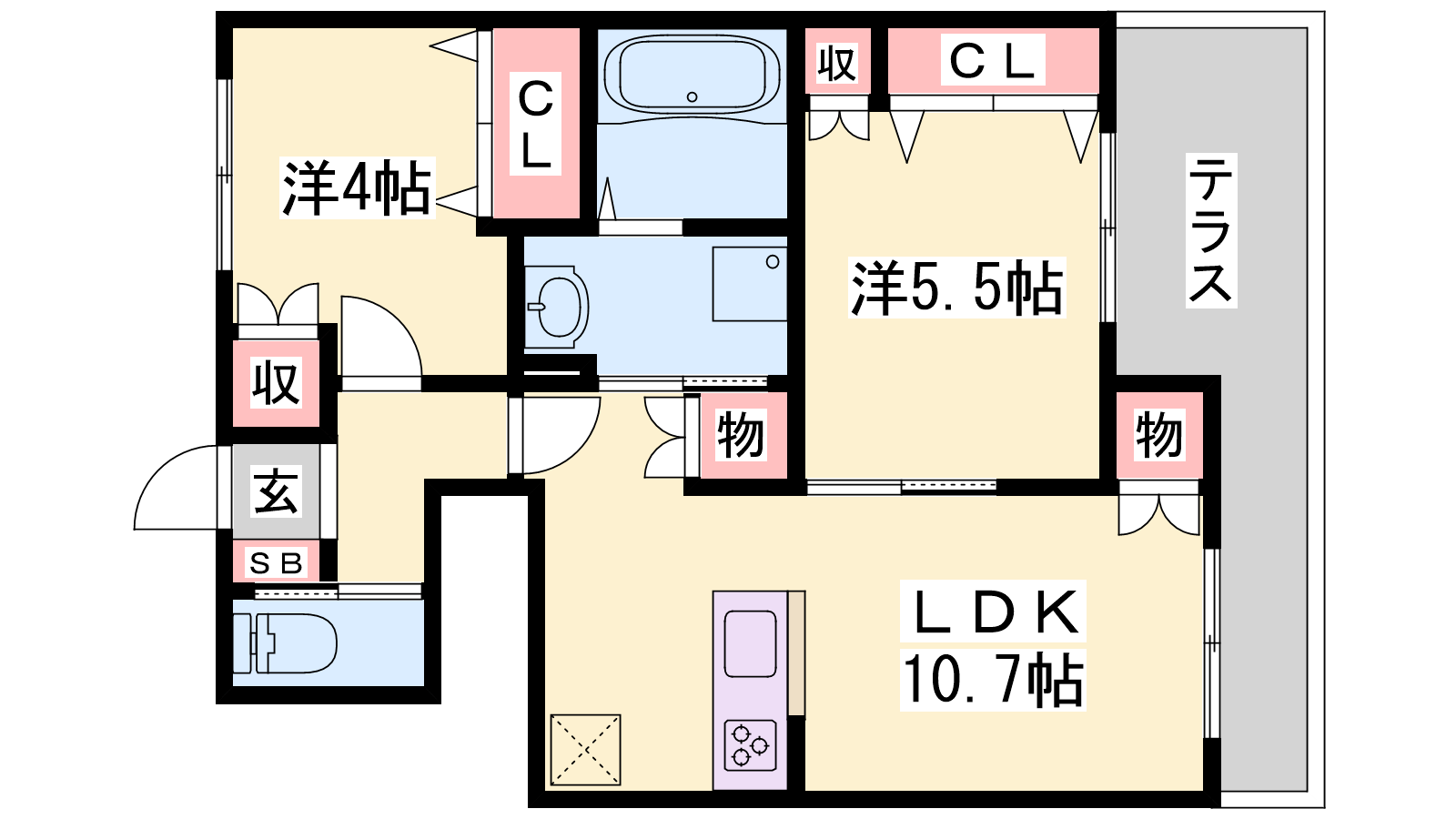 - LDK10.7帖、洋室5.5帖、洋室4帖