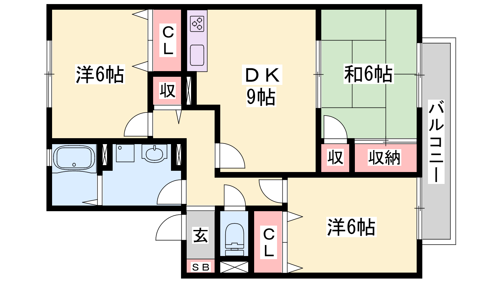 - DK9帖、洋室6帖、洋室6帖、和室6帖