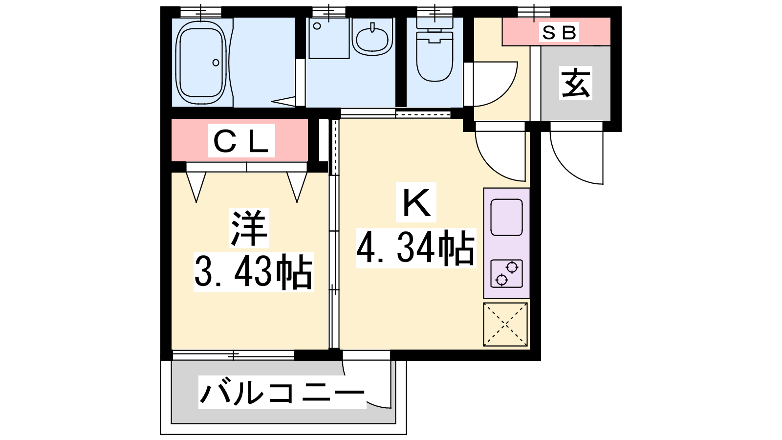 - K4.34帖、洋室3.43帖