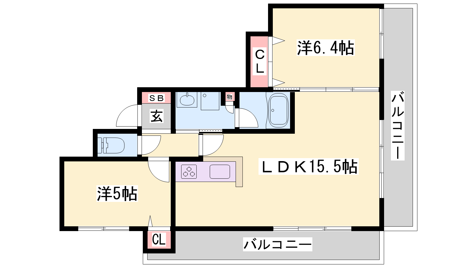 - LDK15.5帖、洋室6.4帖、洋室5帖