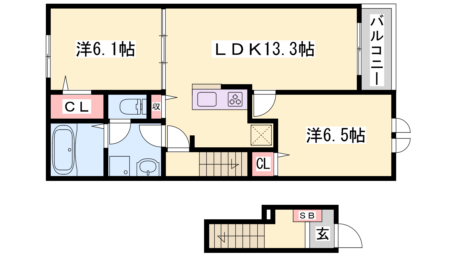 - LDK13.3帖、洋室6.5帖、洋室6.1帖