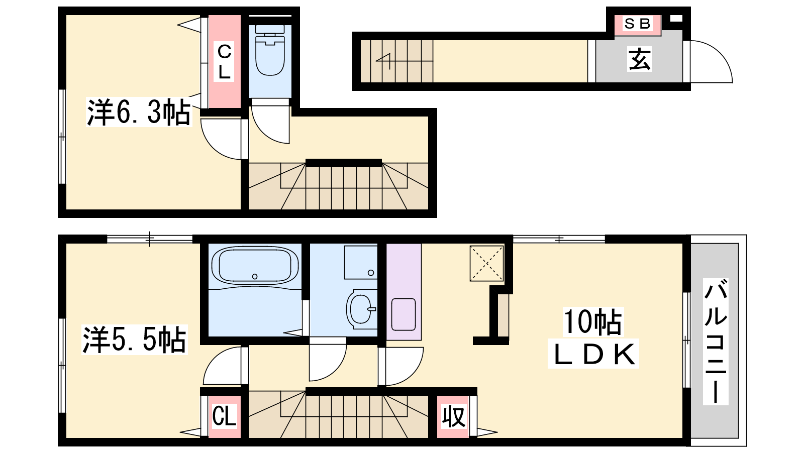 - LDK10帖、洋室6.3帖、洋室5.5帖