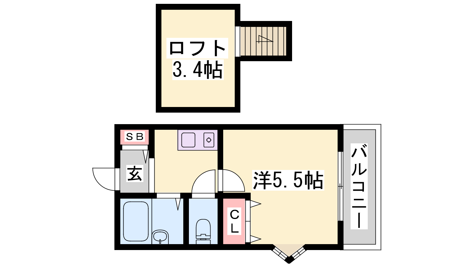 - K2帖、洋室5.5帖、L3.4帖
