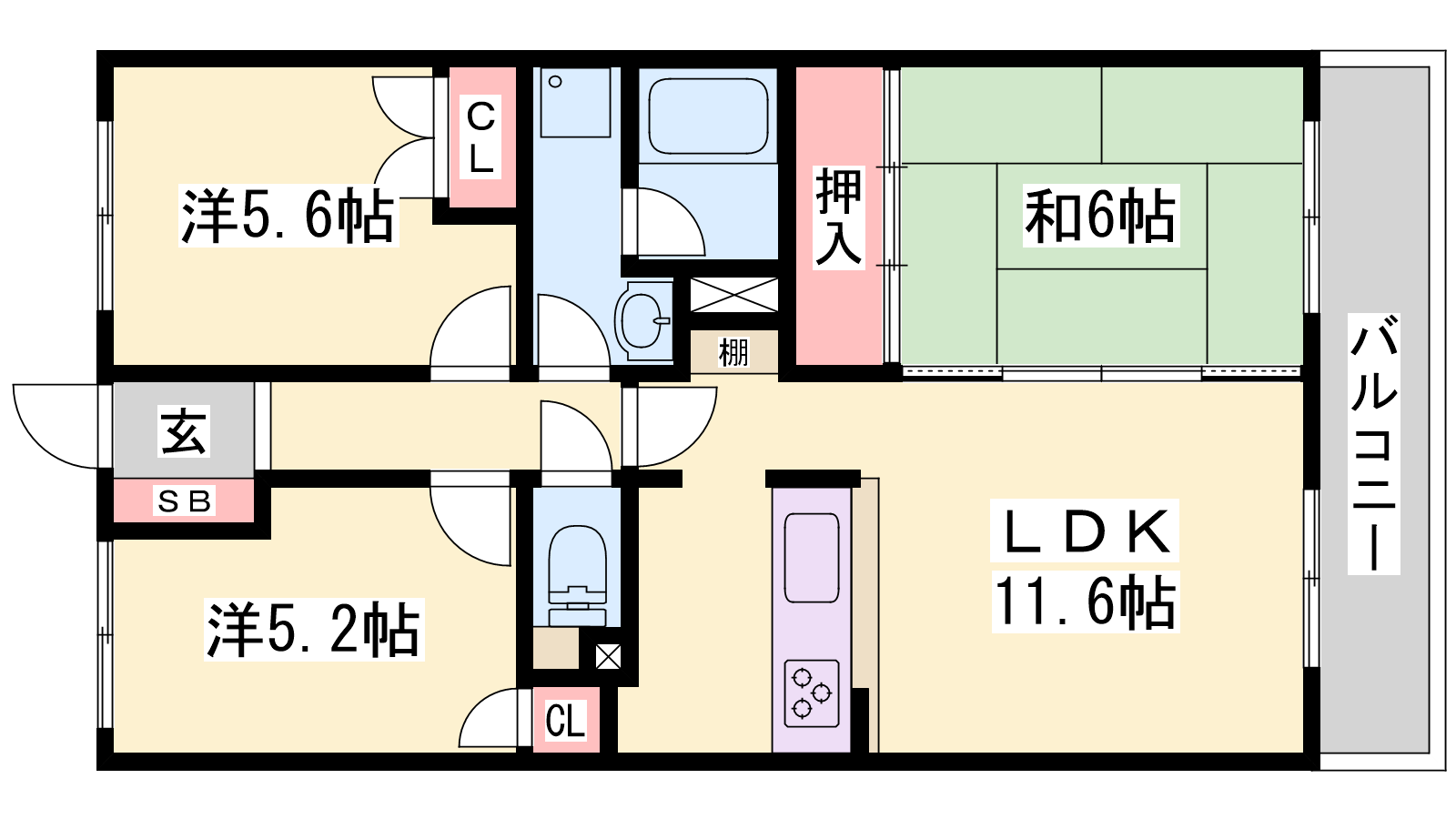 - LDK11.6帖、和室6帖、洋室5.6帖、洋室5.2帖