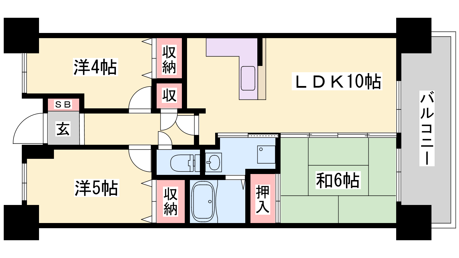 - LDK10.8帖、洋室5帖、洋室4帖、和室6帖