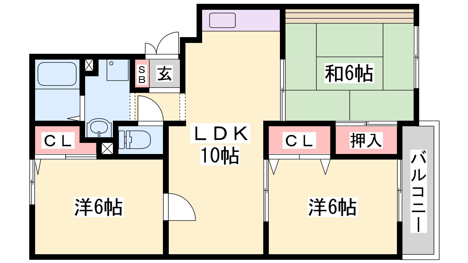 - LDK10帖、洋室6帖、洋室6帖、和室6帖