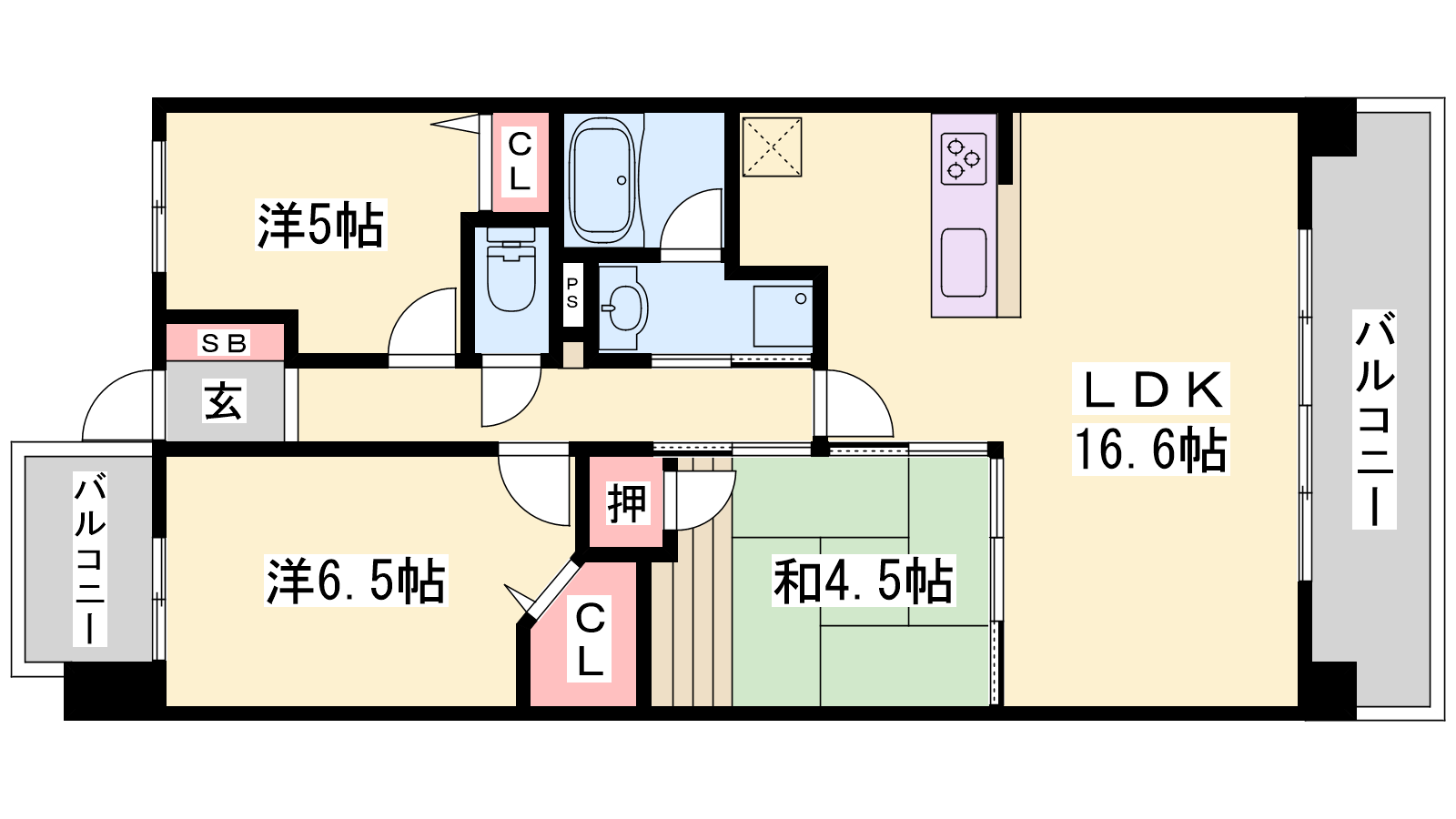 - LDK16.6帖、洋室6.5帖、洋室5帖、和室4.5帖