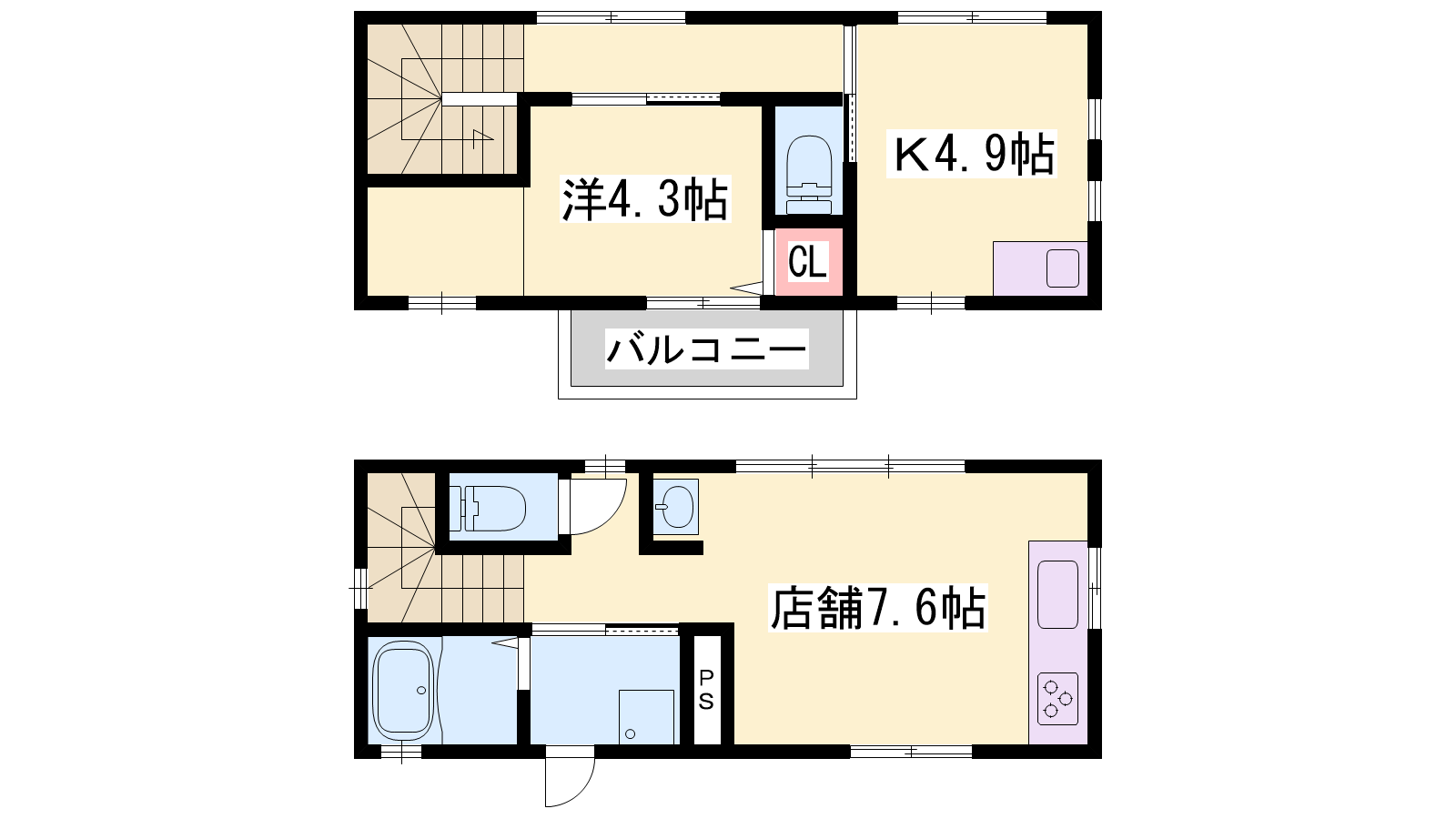 - K4.9帖、洋室4.3帖、S7.6帖