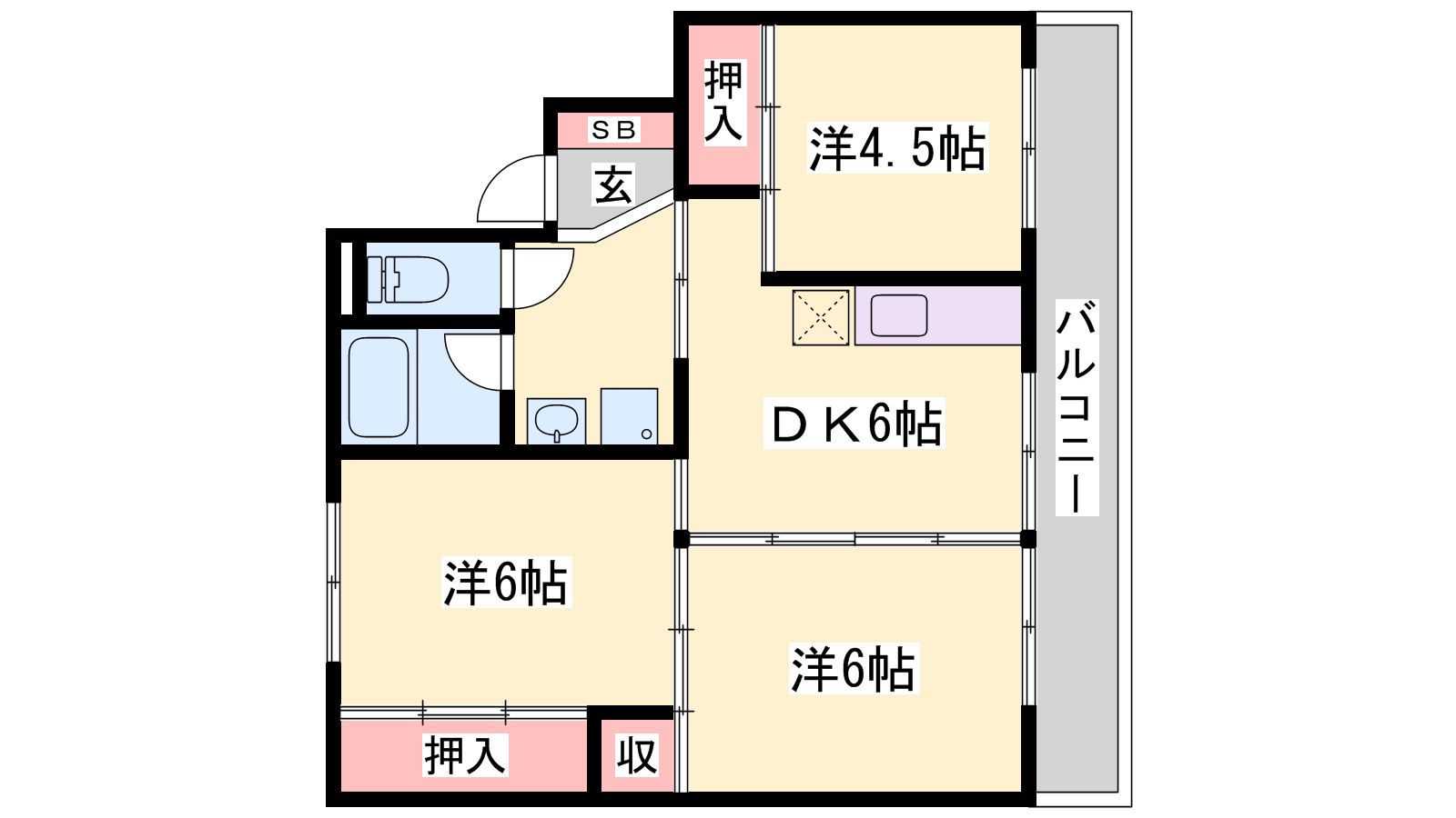 - DK6帖、洋室6帖、洋室6帖、洋室4.5帖
