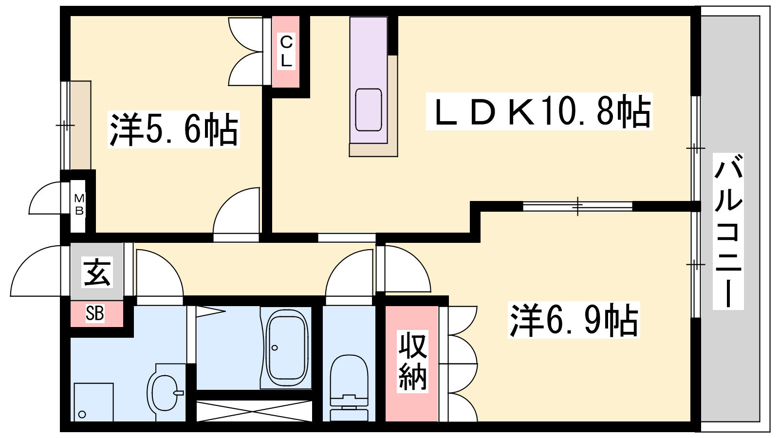 - LDK10.8帖、洋室6.9帖、洋室5.6帖