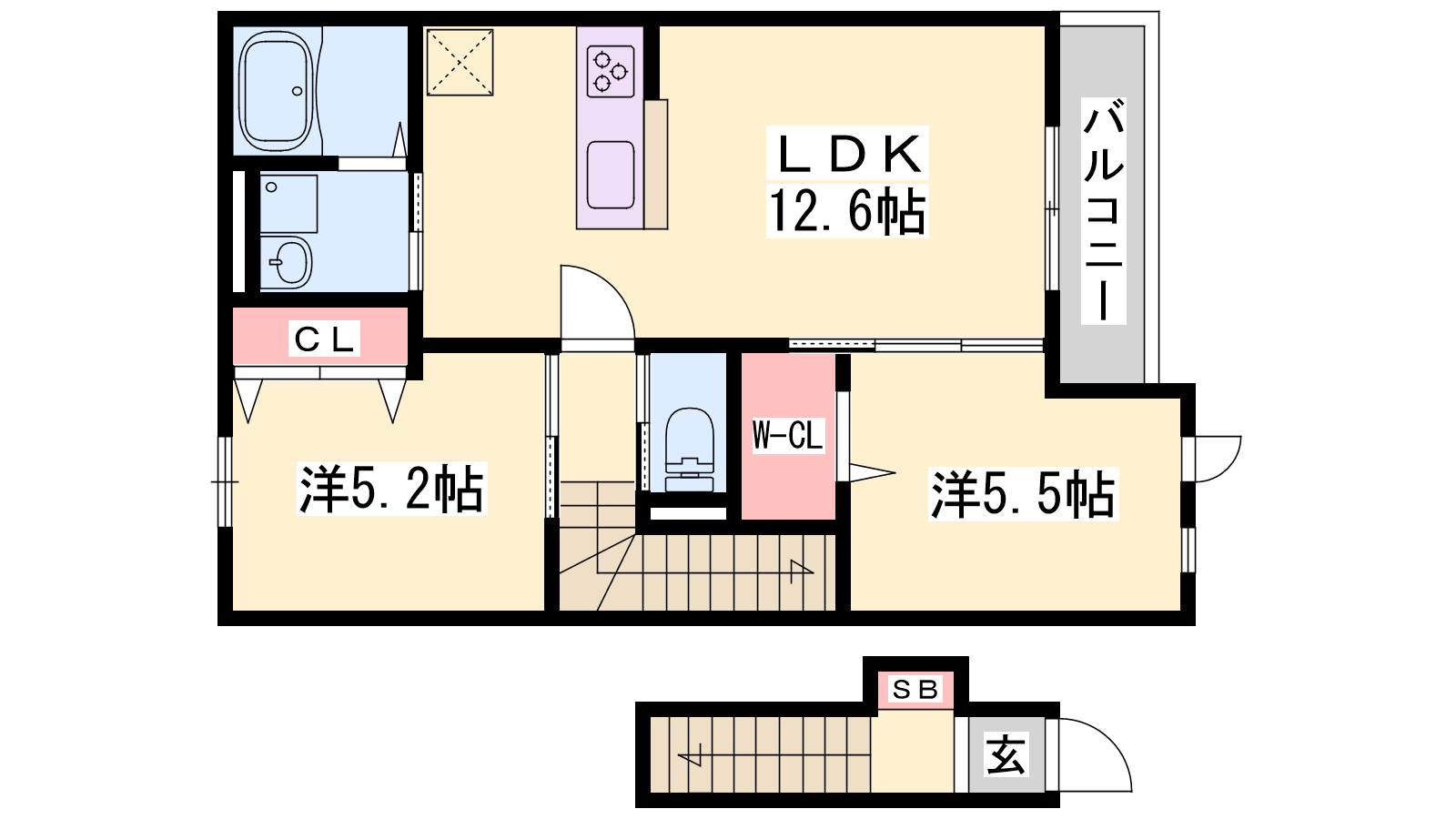 - LDK12.6帖、洋室5.5帖、洋室5.2帖
