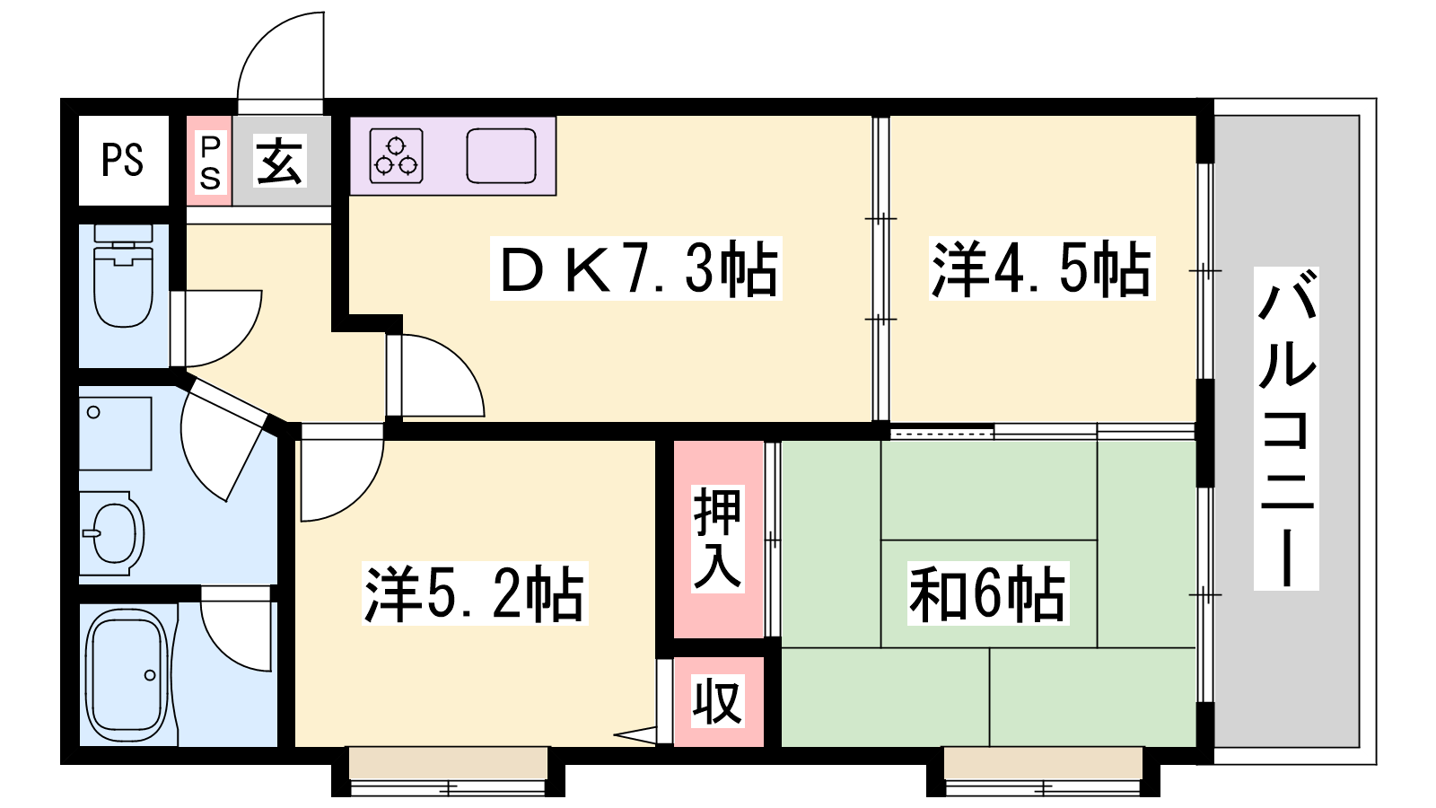 - DK7.3帖、和室6帖、洋室5.2帖、洋室4.5帖