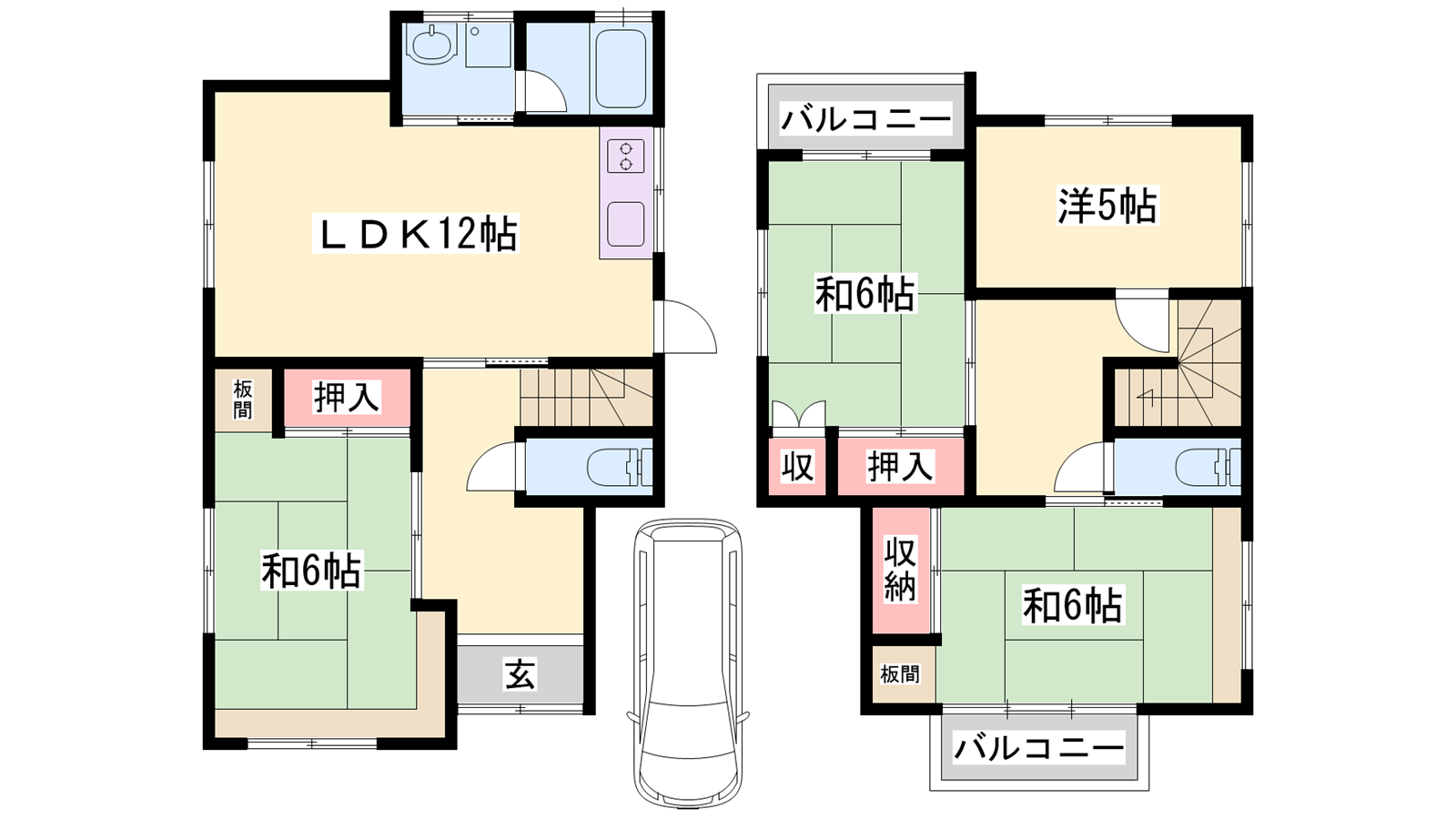 - LDK12帖、和室6帖、和室6帖、和室6帖、洋室5帖