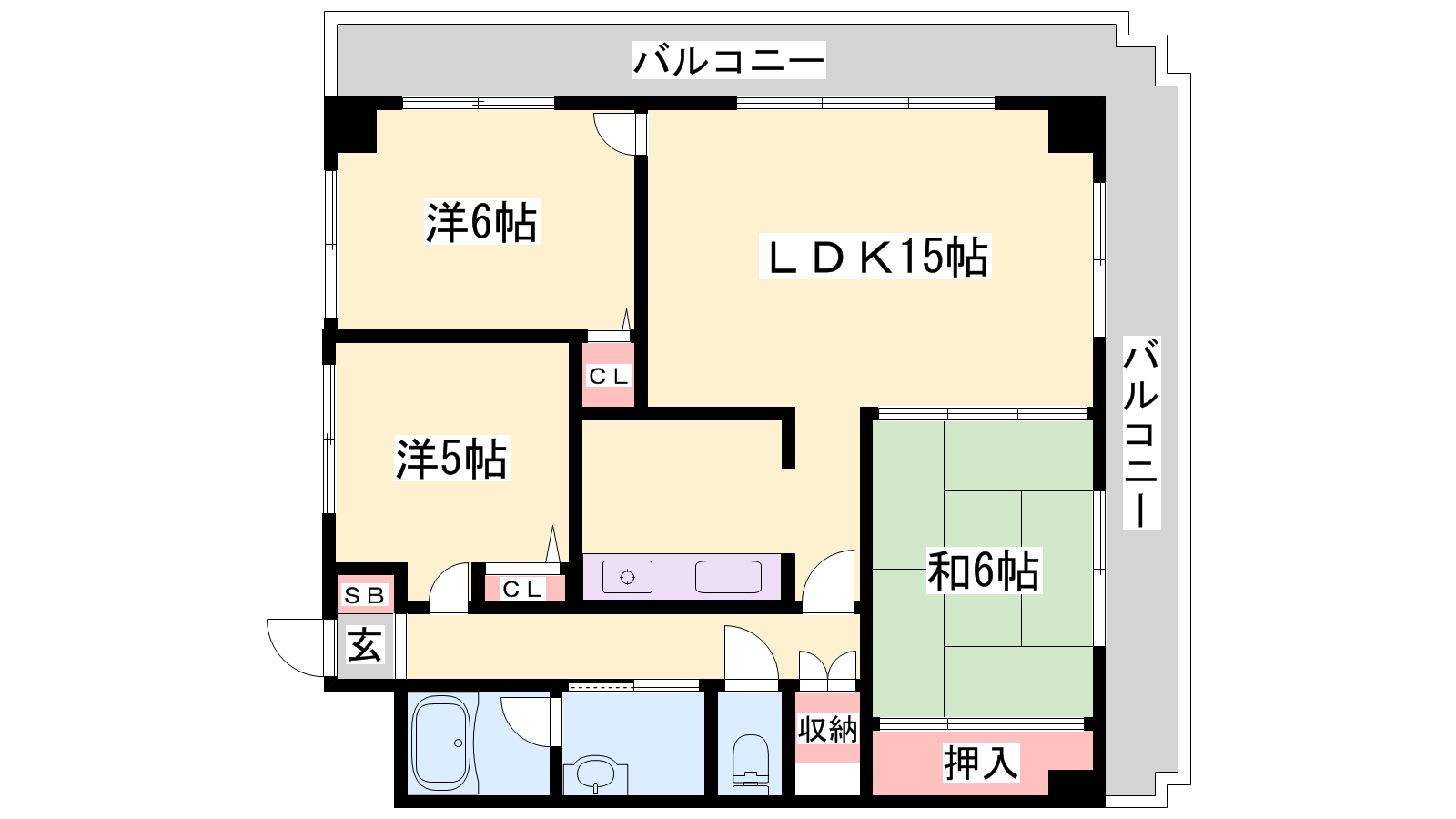 - LDK15帖、和室6帖、洋室6帖、洋室5帖