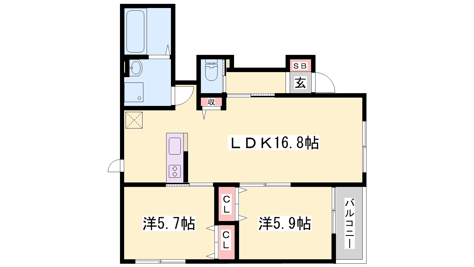 - LDK16.8帖、洋室5.9帖、洋室5.7帖