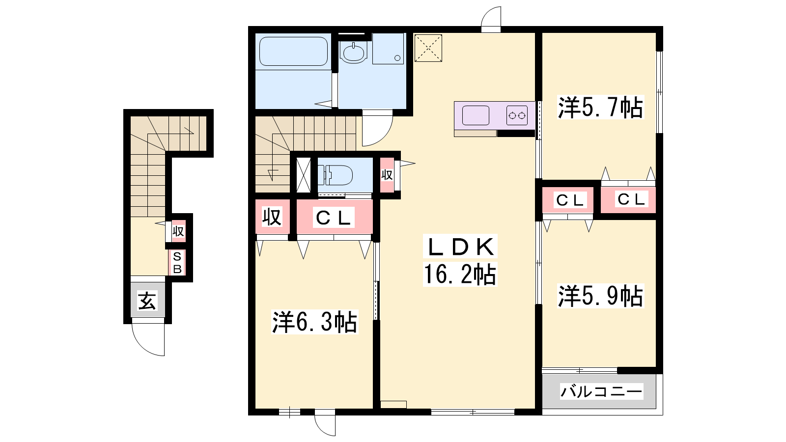 - LDK16.2帖、洋室5.9帖、洋室5.7帖、洋室6.3帖