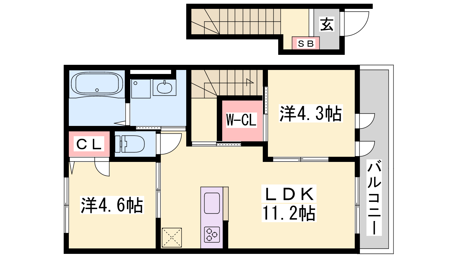 - LDK11.2帖、洋室4.6帖、洋室4.3帖