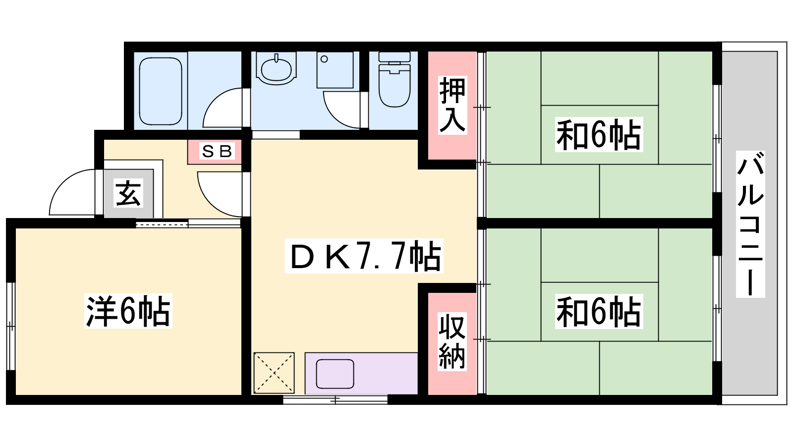 - DK7.7帖、洋室6帖、和室6帖、和室6帖