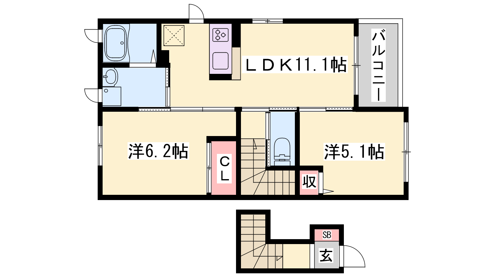 - LDK11.1帖、洋室6.2帖、洋室5.1帖
