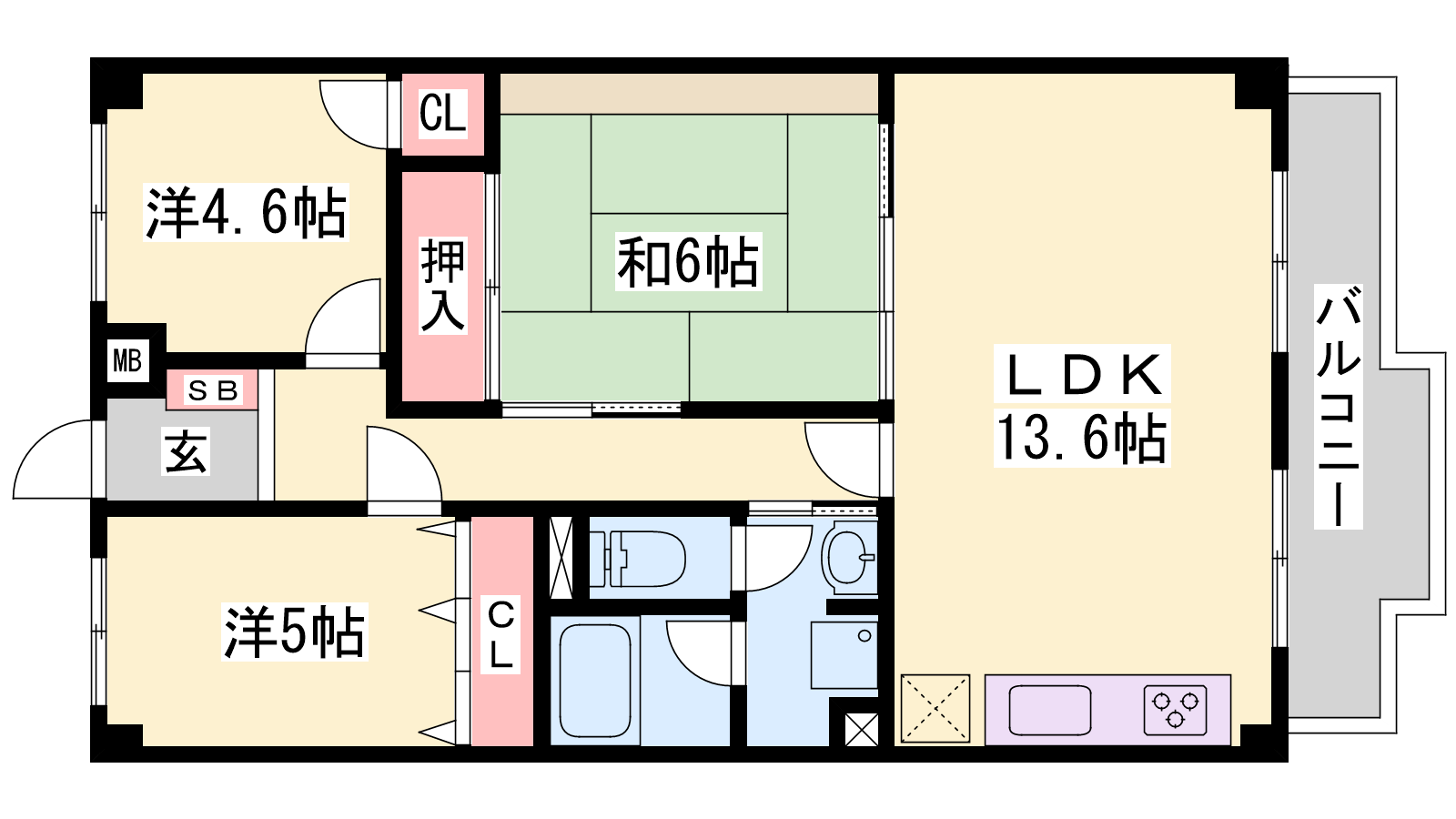 - LDK13.6帖、和室6帖、洋室5帖、洋室4.6帖