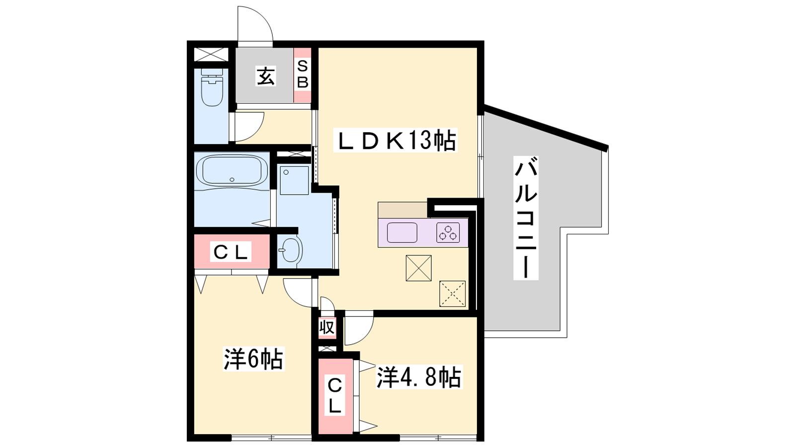 - LDK13帖、洋室6帖、洋室4.8帖