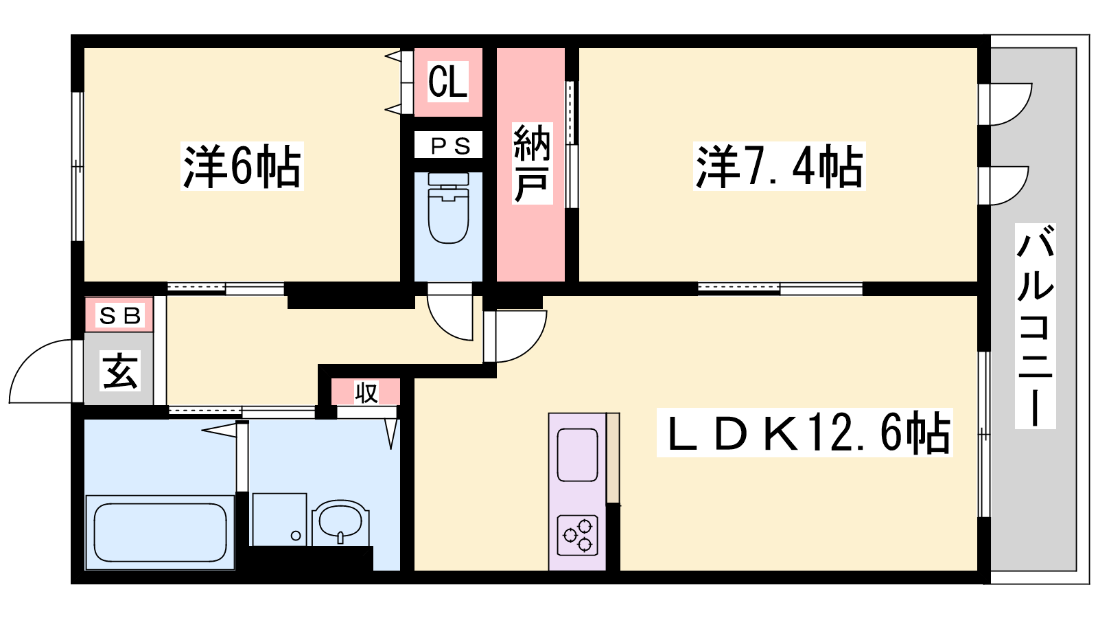 - LDK12.6帖、洋室7.4帖、洋室6帖